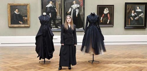 Zeitgenössische Mode trifft auf alte Malerei: Die Münchner Designerin Paulina Bongartz zwischen den Modellen „Black Hole I“ und „Black Hole II“ aus ihrer Kollektion „ad infinitum“ in der Berliner Gemäldegalerie. © Franziska Krug