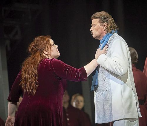 Zivilermittlerin beschuldigt falschen Ritter: Szene mit Miina-Liisa Värelä (Ortrud) und Klaus Florian Vogt (Lohengrin). © Bofill