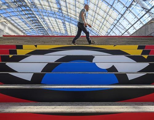 Letzte Vorbereitungen: Tausende werden über diese Treppe mit dem Messe-Logo strömen. © Hendrik Schmidt