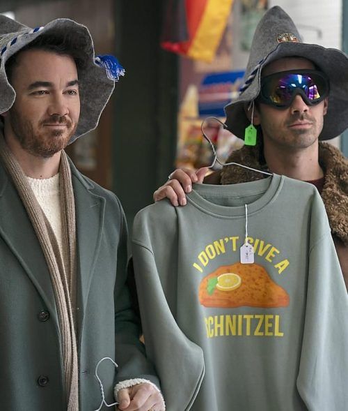 Für ihren Weihnachtsfilm schlüpfen die Jonas Brothers in deutsche Tracht. Ein Foto aus dem Ende des Jahres erscheinenden Film, das Disney+ auf der Plattform X veröffentlichte, zeigt Kevin und Joe Jonas mit bayerischem Filzhut (Screenshot: X)
