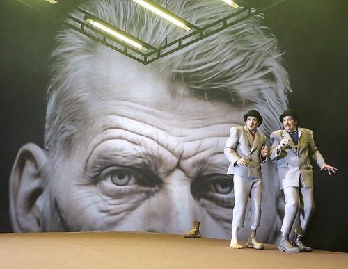 Unter den Augen ihres Schöpfers Samuel Beckett: Estragon (Max Rothbart, li.) und Wladimir (Florian von Manteuffel) warten im Residenztheater auf Godot. © Birgit Hupfeld