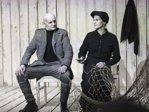 Das Stück passt erschreckend genau in unsere Gegenwart: die Schauspieler Oliver Stokowski und Barbara Horvath in „Die Gewehre der Frau Carrar“. © Sandra Then