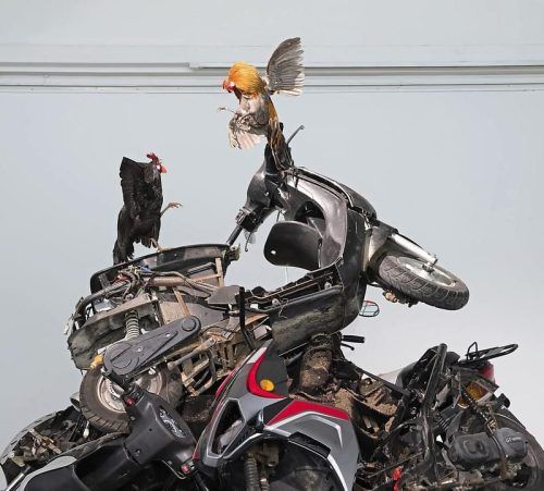 Wo sind wir denn hier gelandet! Da ragt eine Pyramide aus alten Motorrollern auf, an deren Spitze Vincent Scheers zwei ausgestopfte Kampfhähne platzierte – sehr passend zu den Knatterkisten. Und weil der in München lebende Belgier offenbar ein Fai