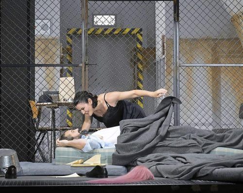 Verführung bei Bombenalarm: Giulio Cesare (Christophe Dumaux) und Cleopatra (Olga Kulchynska) nutzen die Situation auf ihre Weise. © Monika Rittershaus
