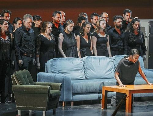 Klage um den toten Geliebten: Jeanine De Bique (Télaïre) mit dem Utopia-Chor. © Marco Borrelli