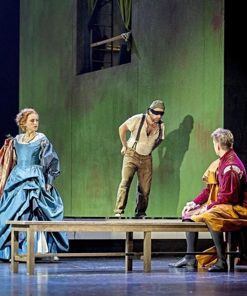 Keine passive Schachfigur zeigt Rocío Pérez als Ifigenia, hier mit Rafał Tomkiewicz und Alasdair Kent. © Birgit Gufler