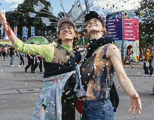 In Konfettiregen tanzen: Glückliche Superbloom-Besucherinnen am Sonntag im Münchner Olympiapark. © Martin Hangen