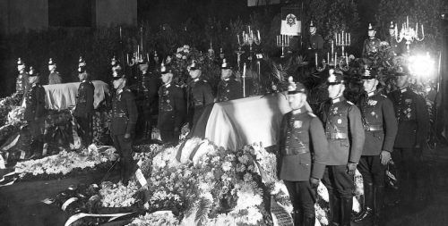 Diese Morde gab es wirklich: Das Foto von 1931 zeigt die Trauerfeier für zwei in Berlin getötete Polizisten. © ullstein