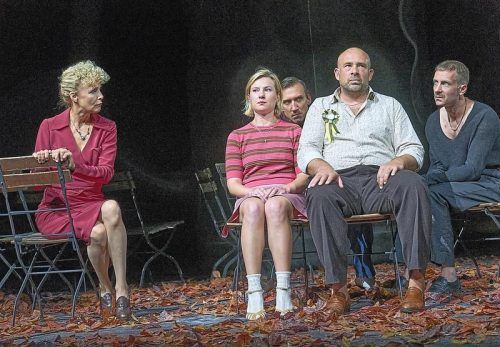 Das Kraftzentrum der Inszenierung: Anna Drexler als Karoline (2. v. li.) und Simon Zagermann (2. v. re.), der Kasimir spielt. Hier mit (v. li.) Juliane Köhler, Thomas Lettow und Max Rothbart. © Matthias Horn