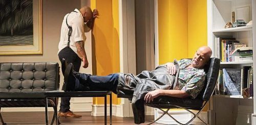 Abgeschlafft: Eric (Tino Führer, li.) und Rainer (Matthias Unruh) im Stück „Schuhe, Taschen, Männer“. © Oliver Fantitsch