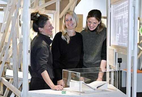 Zwischen den Theaterlatten in der Schau „Making Theatre“: Kuratorin Maren Richter (Mi.), Buchgestalterin Simone Farner (li.) und Regisseurin Elsa-Sophie Jach. © Astrid Schmidhuber