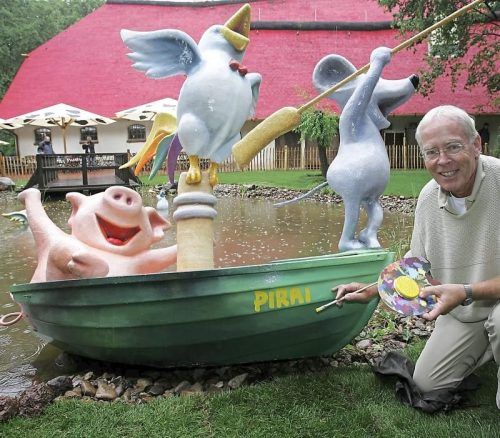Bilderbuch-Künstler Helme Heine mit seinen „Drei Freunden“, die ihn weltberühmt machten. © Peter Steffen/dpa