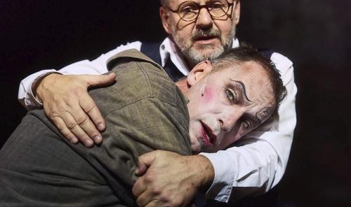 Helfer und Hoffnungsträger: Samuel Finzi als Philipp Auerbach (hier in einer Szene mit Edmund Telgenkämper, vorne), der nach der Shoah Anlaufstelle für die Überlebenden ist. © Julian Baumann/MK