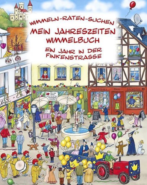 Die Finkenstraße, die sich in diesem Wimmelbuch über ein Jahr und 16 Seiten hinweg in immer neuem Gewand zeigt, scheint eigentlich eher ein belebter Platz in einer kleinen Stadt zu sein. Da finden sich ein Bekleidungsgeschäft, ein Blumenlädchen, eine Bäckerei und ein Restaurant, außerdem ein kleiner