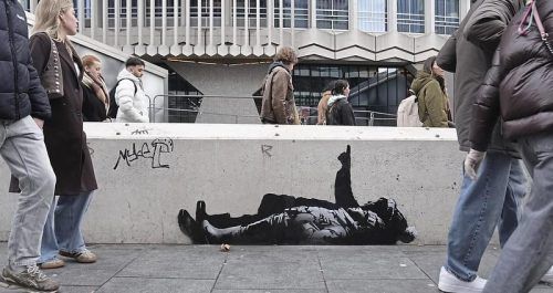 Dieses Graffiti-Kunstwerk, das zwei Personen darstellt und möglicherweise vom Straßenkünstler Banksy stammt, befindet sich im Zentrum Londons. © Stefan Rousseau, Youtube