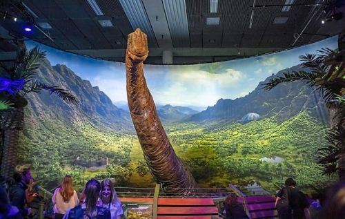 Der langhalsige Brachiosaurier begrüßt die Besucher der Ausstellung. © Martin Hangen