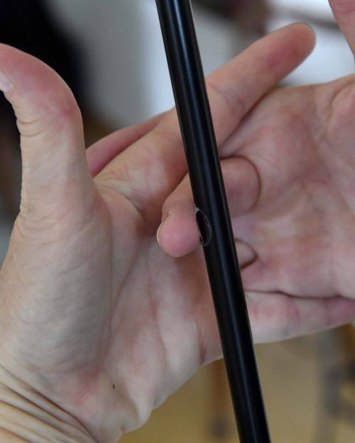 Los geht’s: Klebe ein Klebeband-Röllchen unter die Fingerspitze deines Mittelfingers an der Handinnenseite und zeige das niemandem (Schritt 1). Zeige deinen Zuschauern den Stab