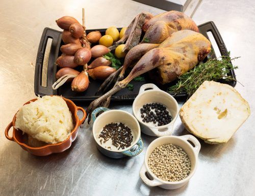 Klassischer Festtagsschmaus: Fasan im Salzteig mit Sauerkraut und Herzogin-Kartoffeln (4 Personen)