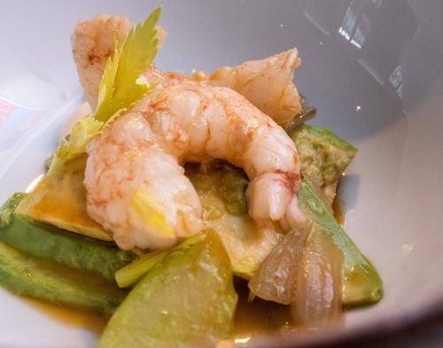Shrimpssalat mit Cocktailsauce 8 Stück Garnelen mit Kopf 0,1 l Olivenöl Saft von ½ Limette 1 Knoblauchzehe ½ Chilischote Meersalz Schwarzer Pfeffer aus der Mühle 1 Avocado 1 Staudensellerie 1 rote Zwiebel Spritzer Reisessig oder Apfelessig Zubereitung: 1. Garnelen schälen und den D