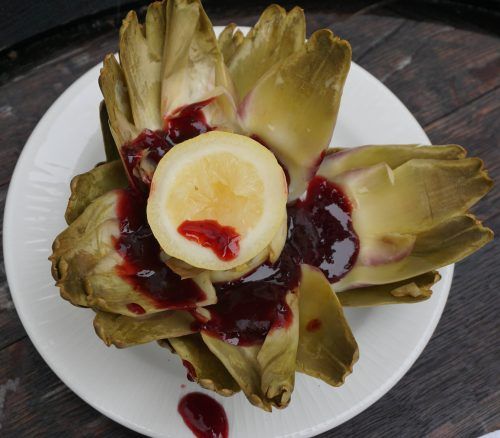 Artischocken gekocht mit Cumberlandsoße (links):