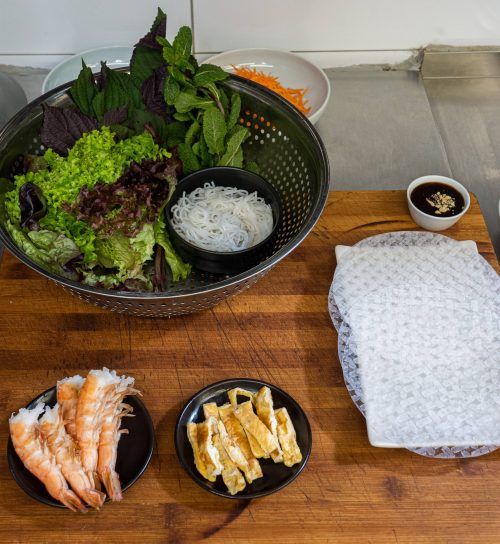 Reispapier Garnelen (TK oder frisch) Salat nach Wahl Kräuter: Zitronenmelisse, Schwarznessel, Minze Gurke Karotten 3 Eier Reisnudeln geröstete Sesamkörner für die Soße: Fischsoße, Wasser, 1 EL Zucker, 1 Knoblauch-Zehe, 1 Chili, 1 Limette Zubereitung: 1. Reisnudeln nach Anweisung auf