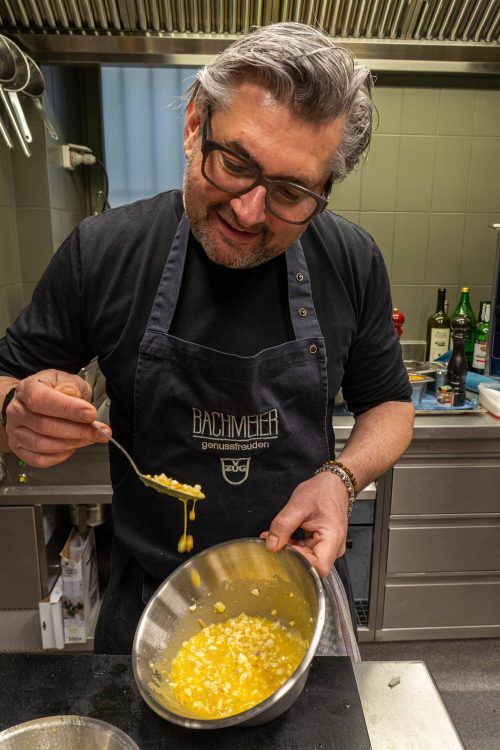 Hans Jörg Bachmeier steht in der „Genussfreuden“-Küche und schält den ersten Spargel. „Das sind für mich die schönsten Frühlingsboten“, sagt der Profikoch. Er fiebere dem ersten Spargel immer entgegen. Der Frühling ist für ihn „eine Zeit im kulinarischen Kalender, die mein kulin