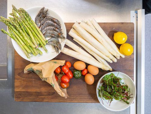 Spargelsalat mit Bozener Sauce und bayerischen Garnelen 20 Stück Garnelen 2 EL Olivenöl 1 Prise Meersalz, Pfeffer aus der Mühle etwas Zitronenabrieb 5 cl Wermut 5 cl Weißwein 0,1 l Spargelsud 16 Stangen weißer Spargel (bevorzugt bayerischer Spargel) 12 Stangen grüner Spargel (bevorzugt bayerischer