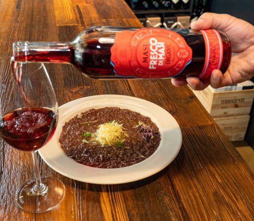 Zutaten: 320 g Risotto-Reis (beispielsweise von Vialone Nano Reis Serego Alighieri) 375 ml Amarone Costasera Masi 30 g natives Olivenöl extra 30 g fein gehackte Schalotte 1 Liter Gemüsebrühe (selbst gekocht aus Sellerie, Karotten, Zwiebeln und Lorbeerblättern) 50 g Butter 60 g geriebener Grana-Pada