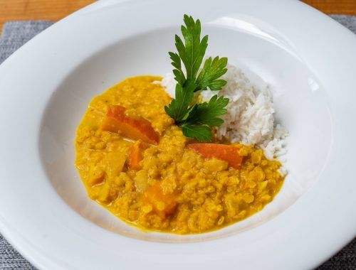 Wärmt von innen: ein Kürbis-Linsen-Curry mit Basmati-Reis