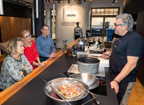 Es ist einer der absoluten Klassiker der französischen Küche. Das Hähnchen – ganz korrekt müsste es heißen: der Hahn – wird dazu in Rotweinsauce mit Speck zart geschmort. „Ich liebe dieses Gericht“, schwärmt Hans Jörg Bachmeier. Und das nicht nur, weil „es so gut schmeckt“. Es s