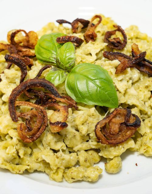 Das schmeckt im Frühsommer: Bärlauch-Spätzle mit Bergkäse und Erdbeer-Shake
