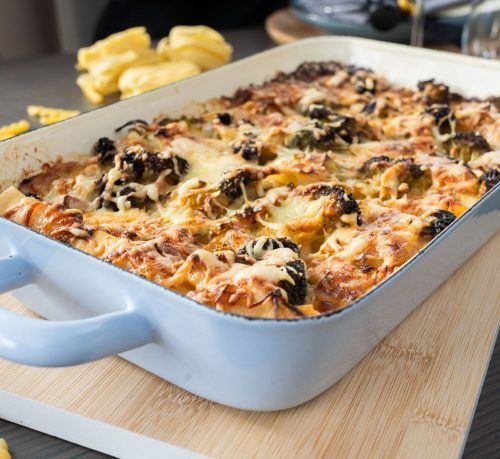 500 ml Schlagsahne Salz Pfeffer Muskat (frisch gerieben) 150 g Mozzarella 100 g Emmentale