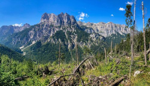 Windbruch ist eine der Gefahren, von denen der Bergwald im Nationalpark Berchtesgaden bedroht ist (gegenüber die Gipfel der Reiter alm; Imago-Foto). Deutschlands einziger Nationalpark in den Alpen umfasst insgesamt 20 808 Hektar. Das Gebiet zeichnet sich durch eine hohe Vielfalt an Lebensräumen aus: