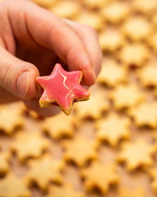 Rote Fruchtsterne Zutaten für den Teig: 360 g Butter ( möglichst gute Markenbutter) 200 g Zucker 3 Eigelb (mittlere Größe) 100 g Haselnüsse 600 g Weizenmehl, 550 für die Füllung: Johannisbeermarmelade für den Guss: Puderzucker gefriergetrocknetes Himbeerpulver außerdem: Sternausstecher Pinsel Nu