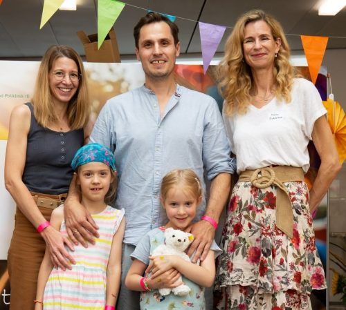 Lebt dank der Car-T-Zellterapie: Krebspatient Marcus Neudecker mit Frau Marina (li.), den Töchtern Maresa und Magdalena und Prof. Marion Subklewe. © LMU-Klinikum/Eva Greta Schenkhut