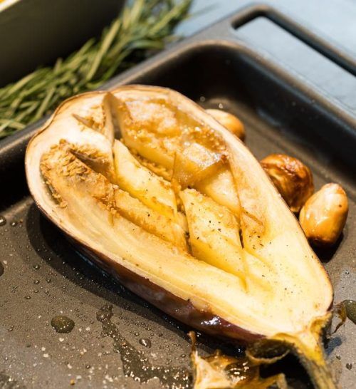 Die Oberfläche der Aubergine kreuzförmig einschneiden.