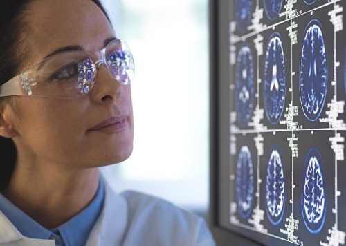 GAU im Gehirn: Eine Ärztin analysiert Schnittbilder einer Computertomografie. Bei einer Demenz gehen Gehirnzellen zugrunde. © Fotos: Image Source / Andrew Brookes, TU München, ADVERB, dpa