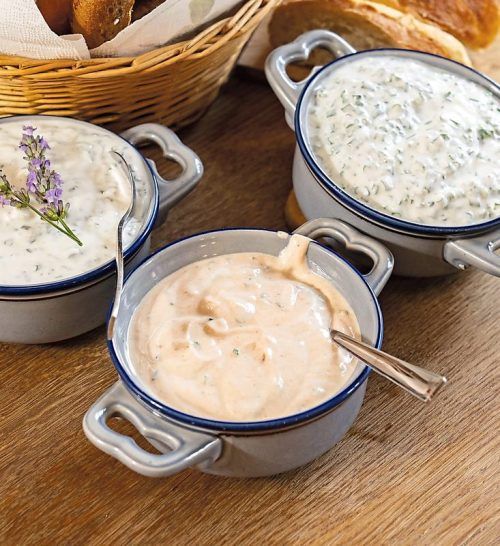 Dreierlei Dips aus Joghurt, verschieden abgeschmeckt.