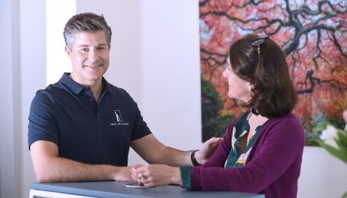Fragen rund um die geplante OP: Schulterspezialist Prof. Ben Ockert berät eine Patientin. © Foto: Praxis Schulter Ockert