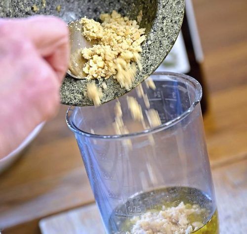 Traditionell werden die Pinienkerne vorher gemörsert.