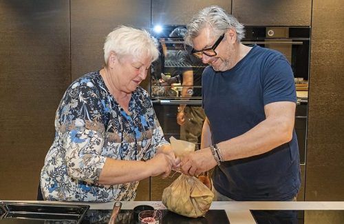 Zusammen geht‘s am besten: Leserin Barbara Baumer bindet das En-papillote-Päckchen mit Spitzenkoch Hans Jörg Bachmeier zu. So bleibt