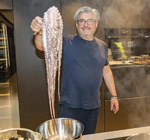 Anrichten: Zum Schluss kommt eine selbst gemachte Mayonnaise über den gegrillten Pulpo und den Risotto.