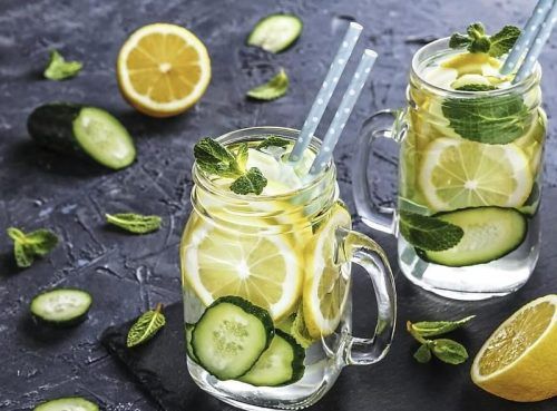 Perfekter Durstlöscher: Eiskaltes Wasser mit frischer Minze, Zitrone und Gurkenscheiben. © Mauritius Images