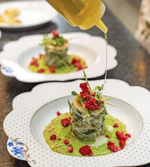 Marinierter Zander, Erbsenpüree, geeiste Himbeeren