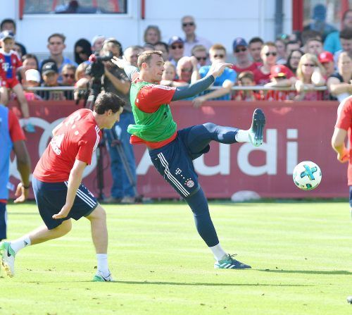 Neuer im Spiel Manuel Neuer macht Tag für Tag Fortschritte – ob es aber für sein Comeback beim Ligastart am Freitag gegen Bayer Leverkusen reicht, ist noch unklar. Am Montag sahen 2400 Fans – mehr durften aus Sicherheitsgründen nicht auf das Gelände an der Säbener Straße – den Kapitän des FC Bayern