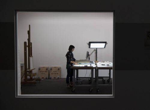 Über weiße Klebefolien am Boden geht es in Bern in die eigens gebaute Gurlitt-Werkstatt. Hier werden Kunstwerke restauriert: Zeichnungen, Gouachen, Holzschnitte, Werke von Liebermann, Dix, Macke und anderen, die die Nazis einst als „entartete Kunst“ brandmarkten und aus Galerien und Museen räumen li
