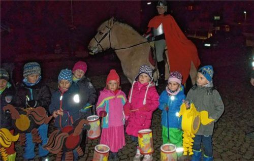Zum ersten Mal führte ein Reiter den Martinszug beim Kindergarten St. Pius in Mühldorf an. Die Kinder zogen mit ihren Laternen durch die Straßen und sangen Lieder. Foto re