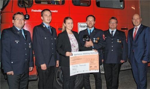 Mit ihrem Wunsch, die Anschaffung der Wärmebildkamera finanziell zu unterstützen, stieß die Feuerwehr Polling bei der Sparkasse Altötting-Mühldorf auf offene Ohren. So erschienen am Freitag Filialleiterin Daniela Penzenstadler und Marktbereichsleiter Christian Braun (rechts im Bild) im Pollinger Feu