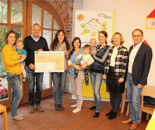 Alexandra Nettelnstroth, Leiterin des Haus der Begegnung, sowie Eltern und Kinder, die im Familienzentrum und Familienstützpunkt ein- und ausgehen, freuen sich über eine Spende der Firma LHL in Höhe von 1500 Euro. Mit dem Geld können für die Eltern-Kind-Räume neue kindgerechte Möbel angeschafft werd