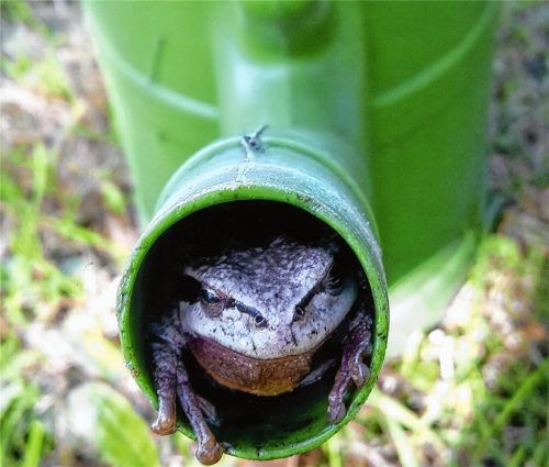 Zwei Frösche haben im Garten von Monika Lechner in Wasserburg eine Heimat gefunden. Einer davon hat sich noch dazu einen ganz besonderen Unterschlupf auserkoren. Und zwar in einer grünen Plastikgießkanne. Dort hatte es sich das Tierchen bequem gemacht, als Lechner ihre Digitalkamera zückte und die A